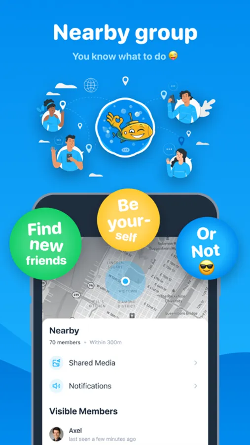 - Talk frankly in anonymous mode while you’re in Nearby group. Hide your real identity from the people around you!
