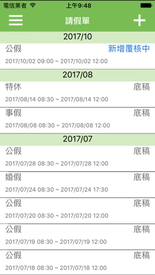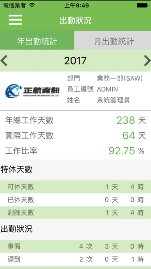 正航APP線上請假整合正航EIP系統上的考勤資料,讓你隨時都能查詢個人考勤及出勤狀況,並能在上面新增請假單。