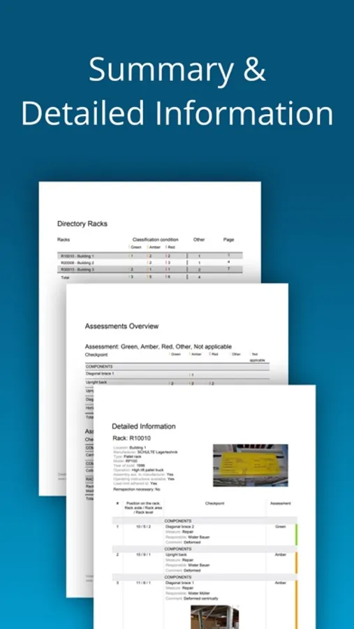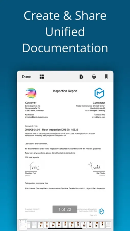 At the end of the process, you create uniform reports and easily share them with your customers and partners, e.g. via cloud services or email. You can also export and backup all your inspection results and rack information at any time.