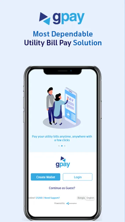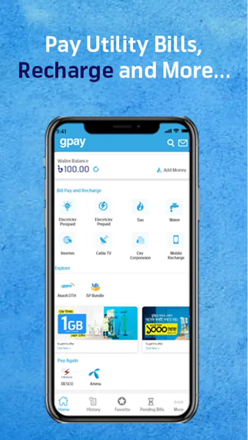GPAY is a mobile wallet that customers of any Grameenphone number can use to recharge their GP mobile numbers, make payments of utility bills (Electricity, Gas, or water), and purchase train tickets from their own mobile number. To use GPAY, customers have to register by using the GPAY mobile app or just dial *777# from any device. Once you are registered, you are allowed to make your payments. To refill your GPAY wallet you can use your bank accounts (Rocket, AB Bank, Islami bank) or if you don't have an account from these banks then you can visit any MobiCash outlet. For a hassle-free payment, the solution starts using GPay from today and opens the window of opportunities for your time and money.