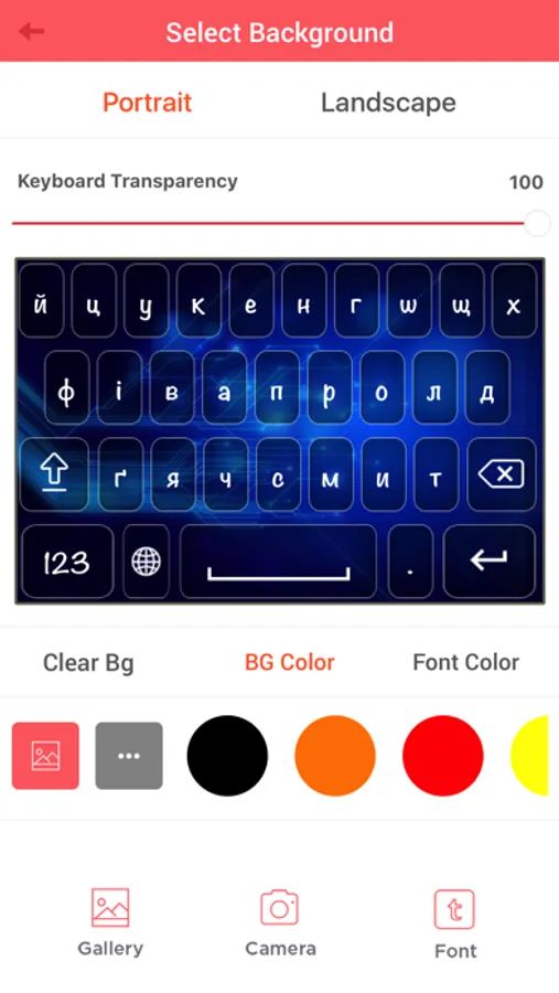 → Customize Theme provides facility of Keyboard Transparency, Background Color, Font Color, Font Apply in Russian keyboard.