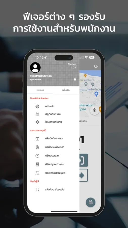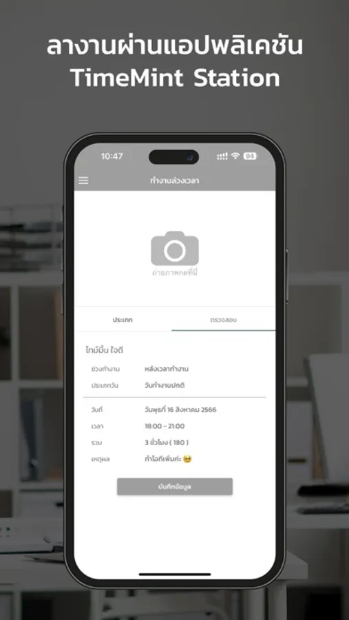 - พนักงานสามารถกดขอลา ดูประวัติการเข้าออกของตนเอง และดูรายการลาที่ได้รับอนุมัติหรือปฏิเสธผ่านทางหน้าแอป TimeMint Station ตัวนี้ได้ทันทีที่ต้องการ