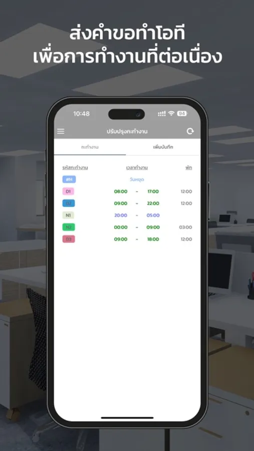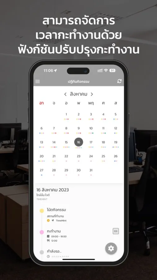 - ดูรายการกะทำงาน แสดงให้เห็นเป็นปฏิทินว่าตนเองเข้ากะทำงานใดในแต่ละวัน (มีการกำหนดกะทำงานล่วงหน้า)