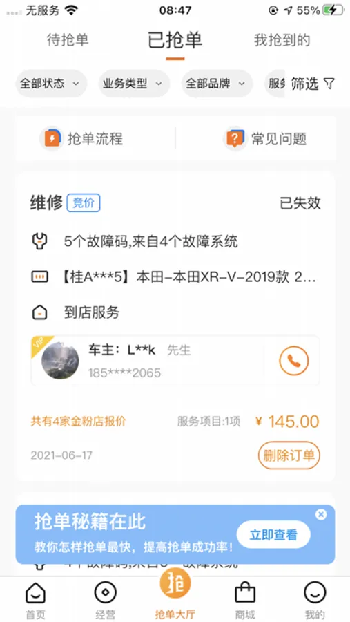汽修抢单是北京金奔腾汽车科技有限公司诊断云平台和汽车云服务结合,专门为金奔腾诊断仪技师提供,服务于广大车主的手机应用。该应用为技师提供了车主车辆维修信息的同时,支持技师对车主提交的维修信息进行报价,从而形成维修合约,可以帮助技师提高维修业务量。