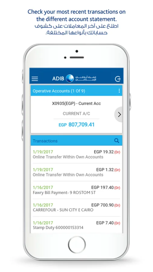 By simply logging in with your same ADIB Egypt Internet Banking Username and Password, you can now enjoy a variety of banking services - from the palm of your hand - on the different types of accounts in addition to conducting financial transactions within and outside your own accounts.