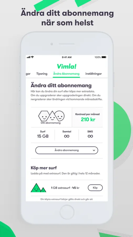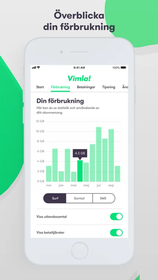 I appen kan du enkelt se din förbrukning, dina betalningar samt ändra inställningar på ditt abonnemang såsom surfnivå, utlands- och premiumtjänster m.m.