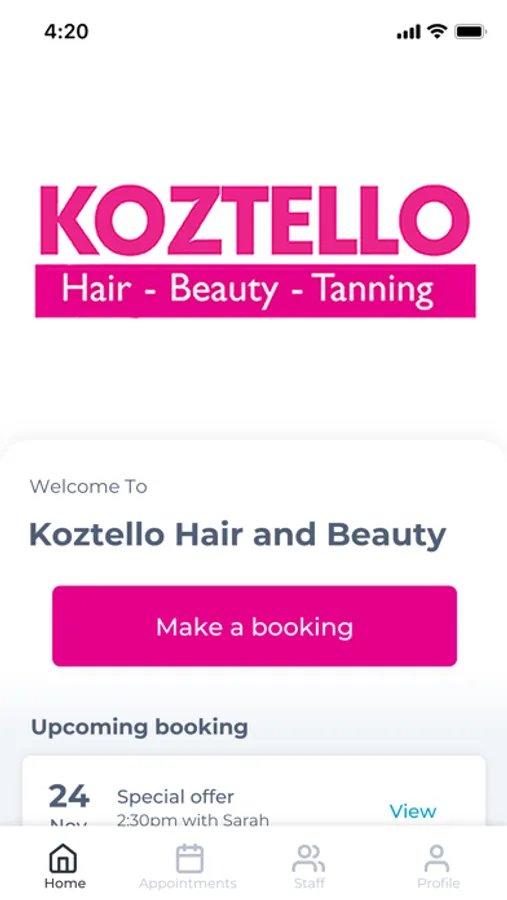 The Koztello Hair and Beauty app makes booking your appointments and managing your loyalty points even easier. You're just a few taps away from feeling good and looking great!