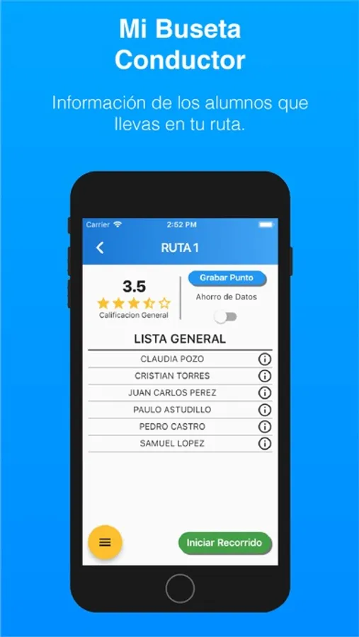 Mi Buseta Conductor es una App que permite al conductor tener un control de asistencia de los niños que lleva en su unidad de transporte, y también poder notificar a los padres cualquier novedad que involucre su ruta. Además, mediante esta aplicación, el conductor envía constantemente datos relacionados con su geo localización dándoles a los padres la oportunidad de ver la ruta de sus hijos en tiempo real en cualquier momento del recorrido.