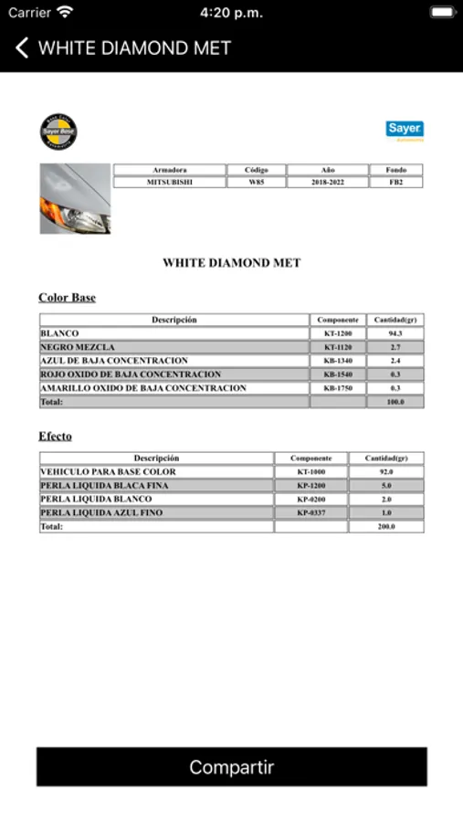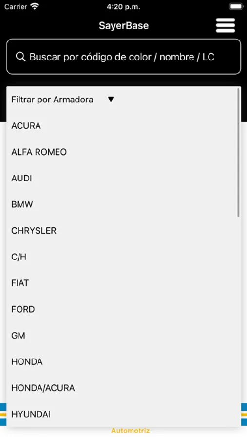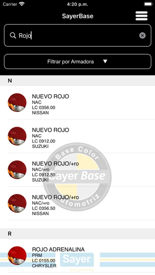 Sayer Car es una aplicación que te servirá para ubicar el código de color de armadoras. Así como información referente al código de color, año, fondo base. Sayer Car cuenta con acceso a distribuidores Sayer que contaran con acceso total al catalogo de formulas de las armadoras y procesos para lograr diferentes efectos de color personalizado.
