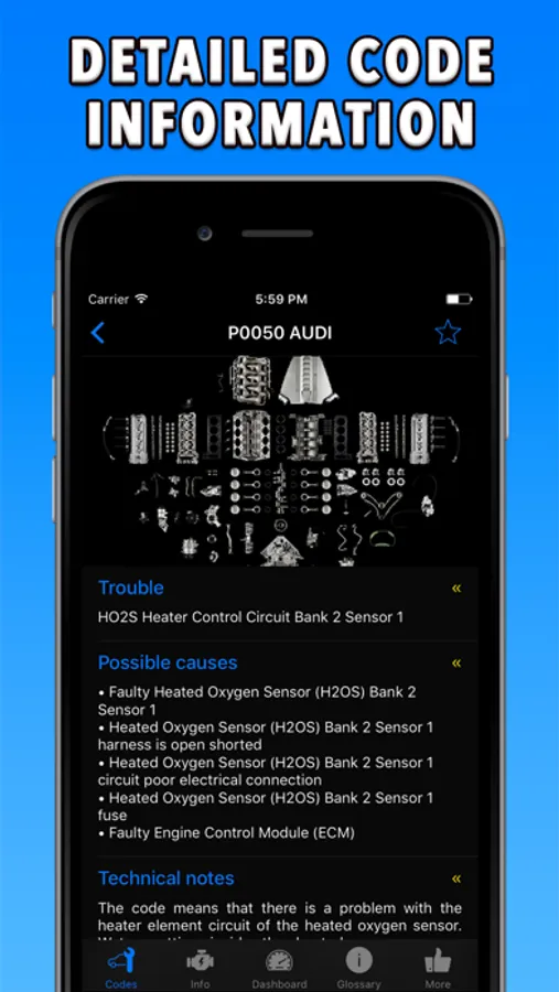 • Title, "Possible causes", "When is the code detected?", "Possible Symptoms" and "Description"