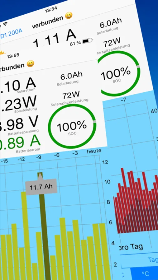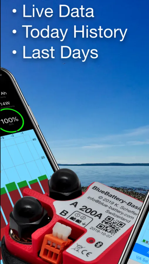 BlueBattery is a Bluetooth Smart (BLE) based system to display and record vital electrical parameters of a RV battery system. The small outline device connects directly in line of the battery. An additional connection to the solar charger or booster completes the installation. This App displays all recorded data as well as live measurements.