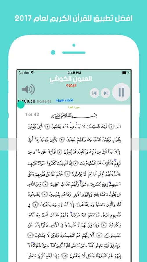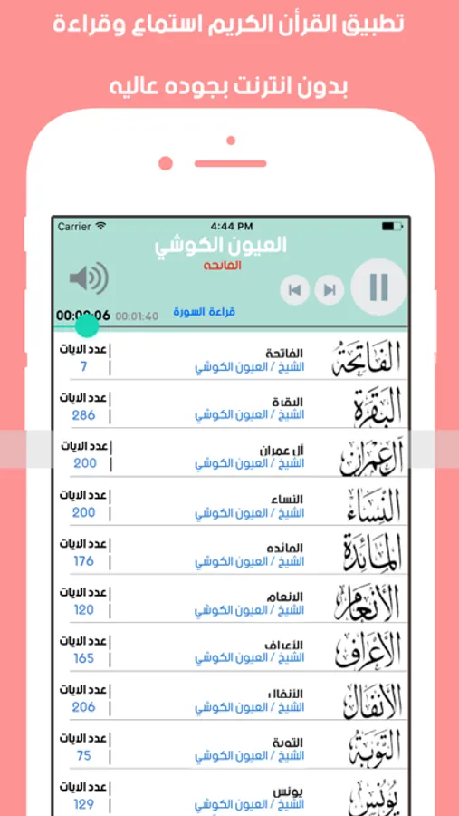 تطبيق القران الكريم يتلوه الإمام الشيخ العيون الكوشي وبدون الاتصال بالانترنت يتميز هذا التطبيق بصوت رائع و شجي من الشيخ العيون الكوشي و بنسخة نقية وبدون الحاجة للاتصال بالانترنت يعمل هذا التطبيق حتى لو كان الجهاز مقفلا , قد ارتاينا في التطبيق استعمال سيرفرات عالية الجودة والحماية لكي يتم استعمال وتحميل البرنامج بشكل سريع وبدون اي مشاكل.