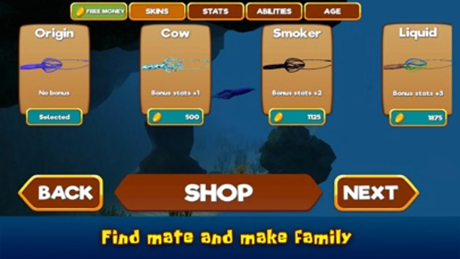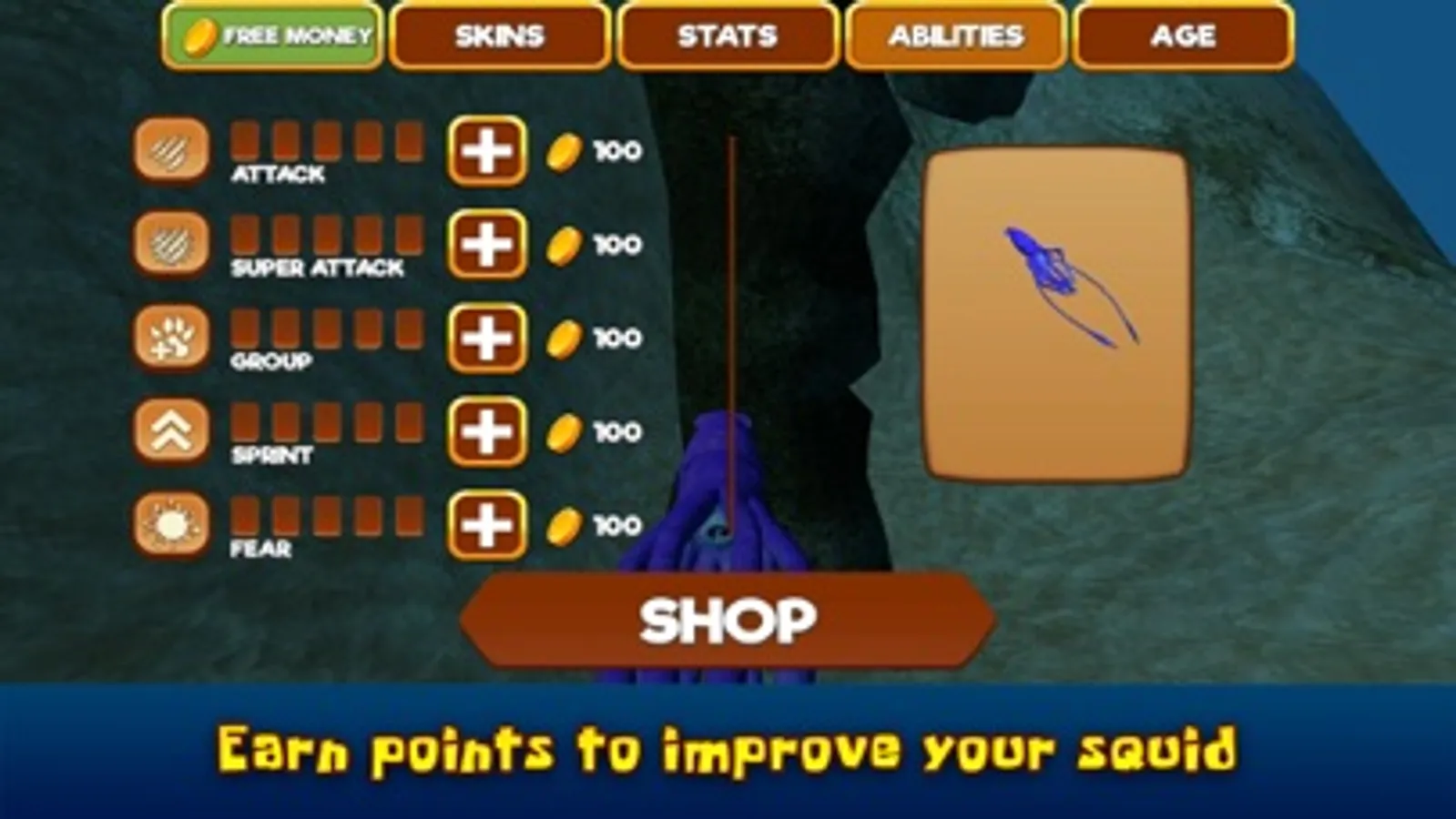 Earn points for your successful surviving skills and unlock new colorful skins for your super underwater creature – check various like Japanese flying squid, Architeuthis, European squid, Antarctic cranch squid (like a true Kraken) and glass squid! Level up your skills and buy some power-ups to improve them and become the best squid in the ocean!