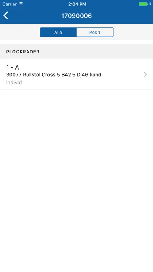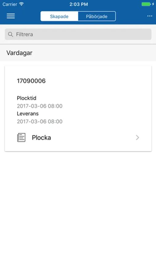Plock, där du återrapporterar plocklistor direkt i appen. Plocklistorna kan grupperas, filtreras och reserveras av resurs. Vid återrapportering kan man bl.a slutleverera, restnotera och nolleverera samt ange antal godsetiketter.