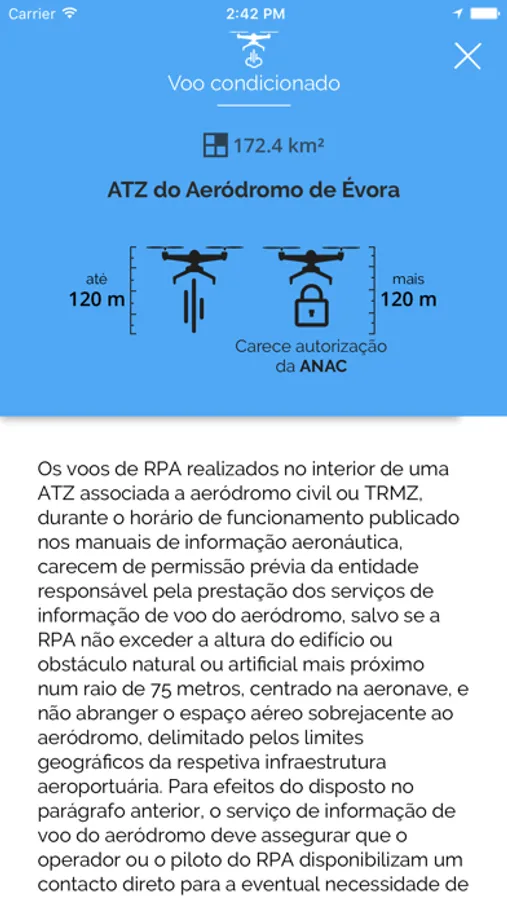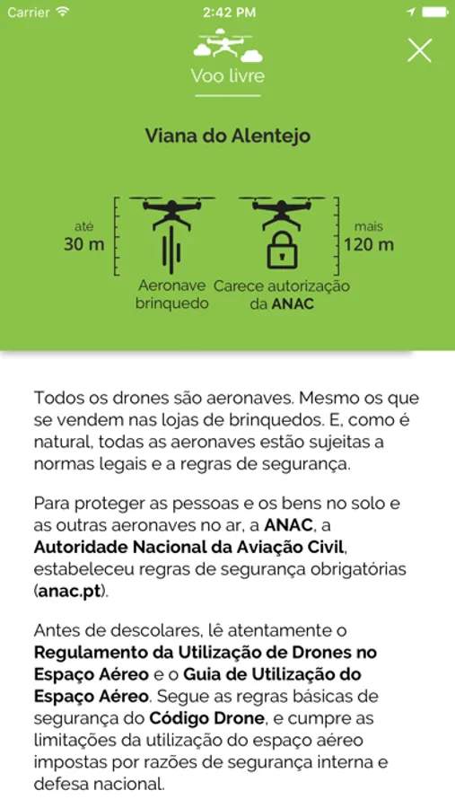 Voa na Boa App é uma aplicação que permite aos utilizadores saberem em que condições podem voar com o seu Drone no território Nacional (Portugal Continental). A aplicação permite identificar a tua localização e ilustra no mapa de Portugal as diferentes áreas e condições de voo em cada uma delas, nomeadamente, áreas de voo livre, voo condicionado, voo sujeito a autorização, áreas de jurisdição militar e áreas de voo proibido. É também possível consultar o Regulamento de utilização de Drones e planear o teu voo. Está nas tuas mãos garantir a segurança de todos em terra e no ar. Segue as regras e…voa na boa.