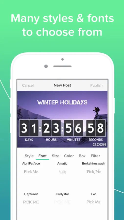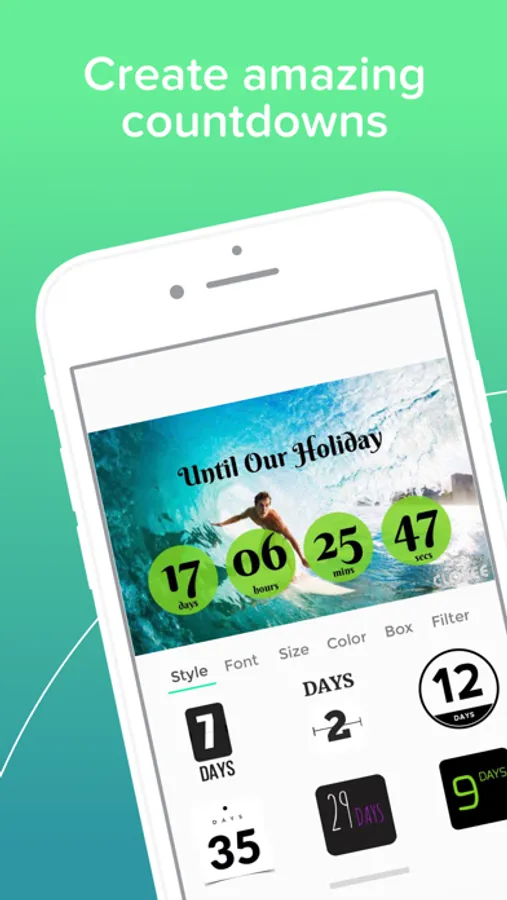 You can choose from a variety of different styles, fonts and filters. Personalize your timer by adding your own photo or by choosing one from our wide gallery.