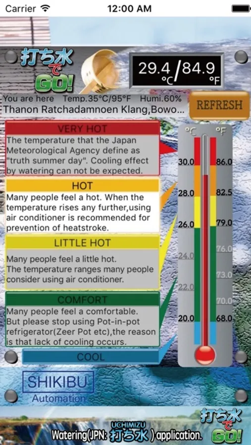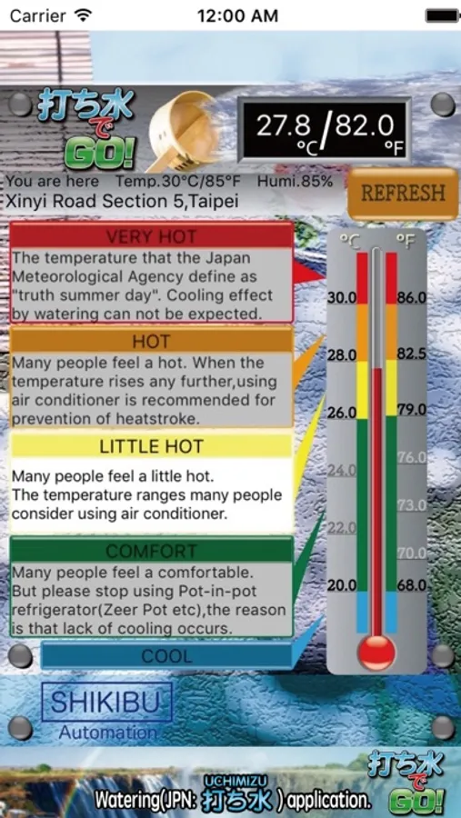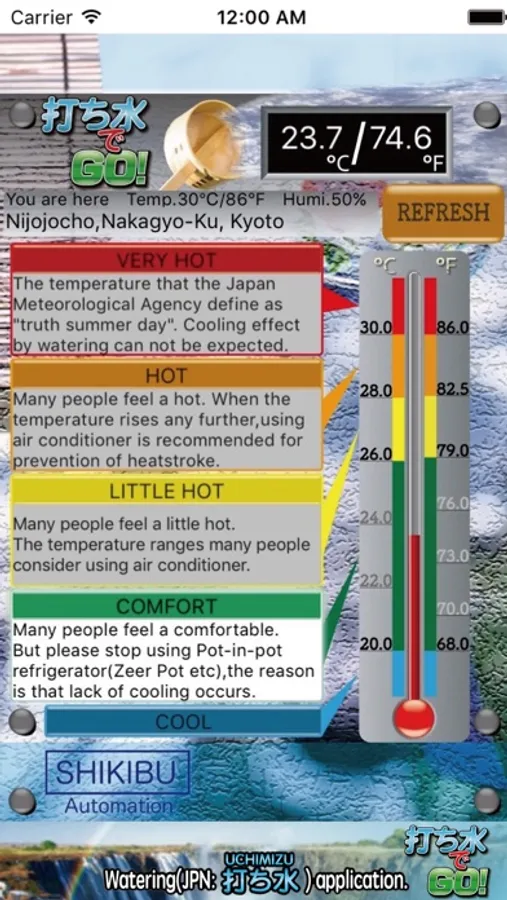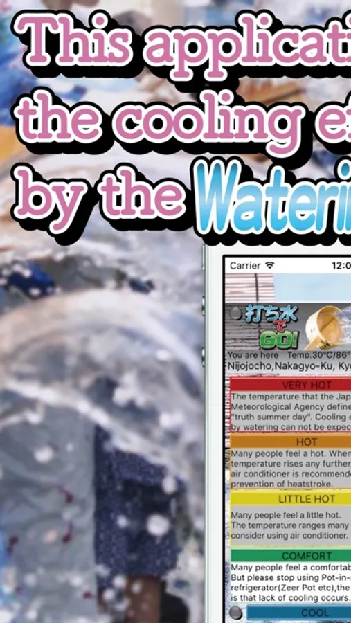 The app uses GPS function, and just tap the "START!" button and this app will calculate and notify you of the estimate temperature(*1) after watering in current location.