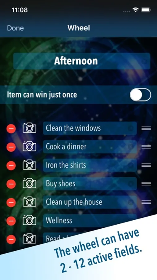 The wheel enables you to choose 2 - 12 active fields where you can insert any desired text or a photo from camera.