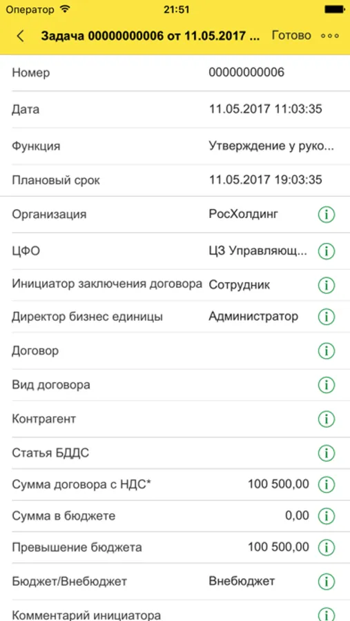 - отредактировать значения реквизитов шапки примитивных типов (строка, дата, число, булево) и выполнить/провести задачу. При этом информация попадет в основную базу системы ИНТАЛЕВ: Корпоративный менеджмент 7.