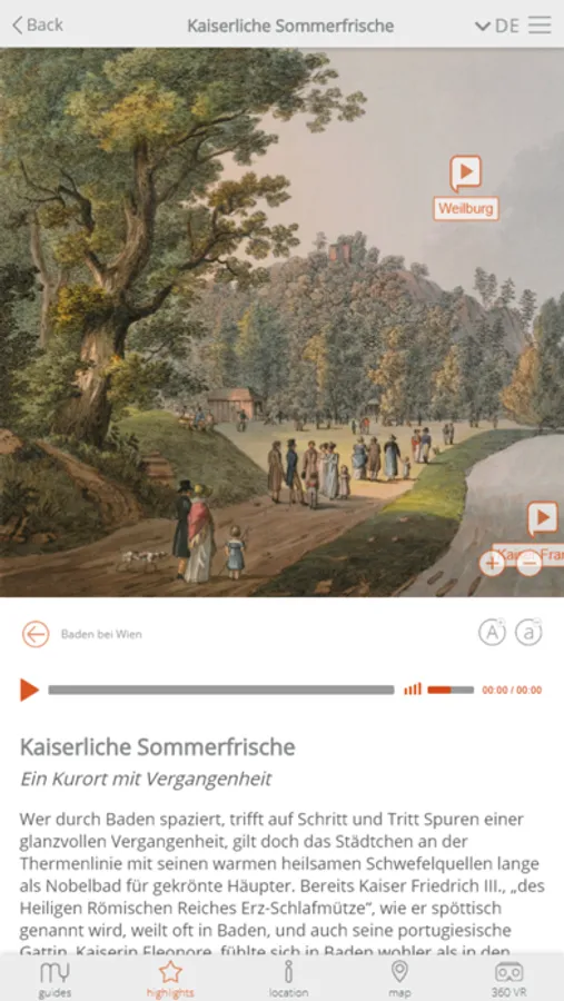 Alle Guides von beyondarts besitzen neben Text und Bildern auch eine mehrsprachige Audiofunktion. Baden bei Wien bietet dir den Audioguide für das eigene Smartphone. Mit spannendem Story-Telling speziell für deinen Audiogenuss aufbereitet.