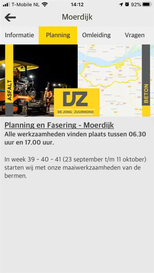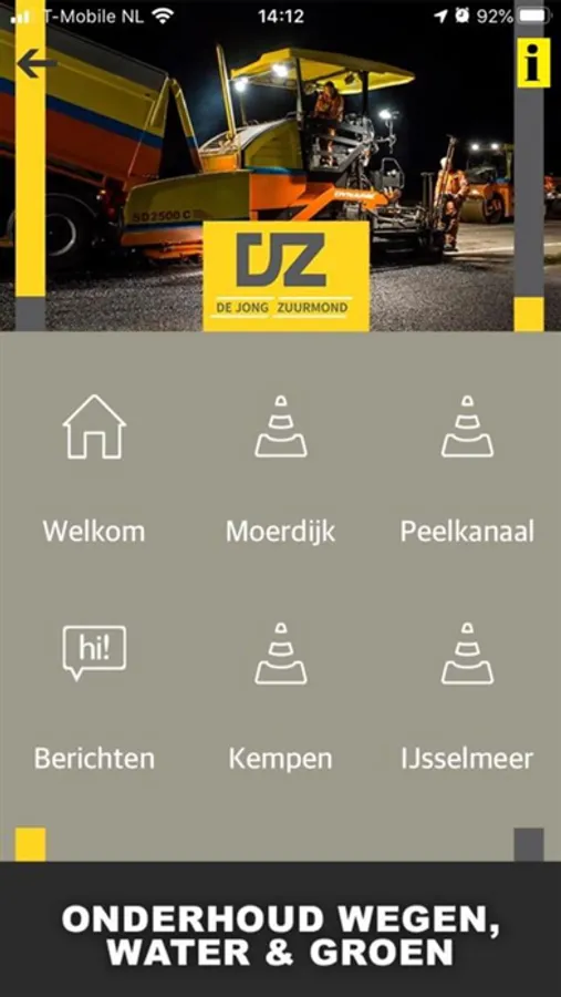 In deze app vindt u alle informatie over de werkzaamheden van De Jong Zuurmond in Barneveld en in Kempengemeenten. Deze werkzaamheden bestaan aan onderhoud aan de asfaltverhardingen en betonverhardingen. Er worden updates over de voortgang van de werkzaamheden en er wordt informatie over het project weergegeven. Ook kunt u op deze app vragen, opmerkingen of klachten achterlaten die betrekking hebben op het project.