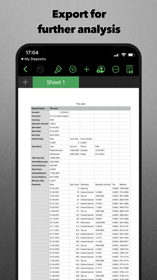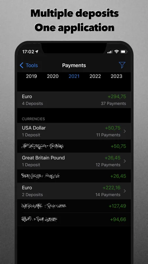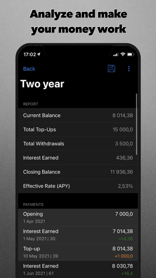 A variety of all possible deposits in one single app. Stay informed about your expected income and upcoming payments.
