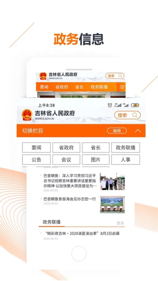 吉林省政府移动客户端现开通要闻、领导,政务、政策等栏目,发布吉林省重大决策部署和重要政策文件、吉林省领导同志重要会议、考察、出访活动等政务信息,同时面向社会提供与政府业务相关的各类互动窗口,建设基于新媒体的政府与公众互动交流新渠道。