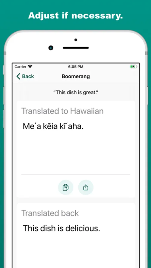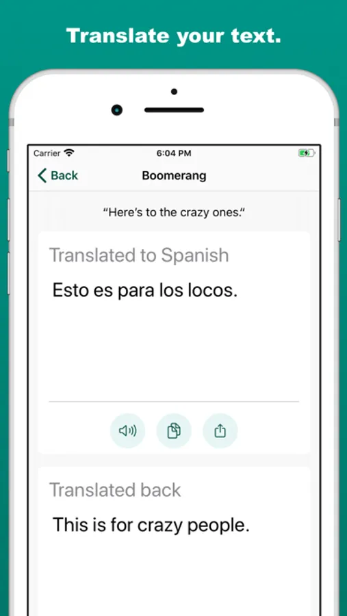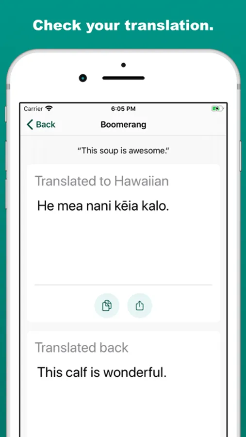 Boomerang leverages Google Translate to provide translations between over 100 languages. Translating isn’t always perfect though, and can lead to embarrassment. To help avoid this, Boomerang translates from one language to another and then back again so that you can verify the translation is what you intended. If needed, you can also try adjusting your statement to get a result closer to what you want to say.