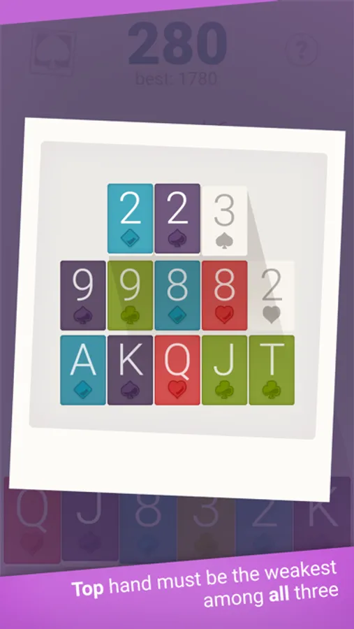 The game was heavily inspired by Chinese Poker with its many variants (especially Open Face Chinese and Pineapple) and mobile puzzle games, like Threes, 2048 and Merged