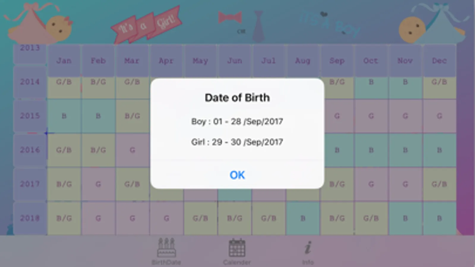 All of the other baby gender prediction applications requires you to set the date of conception or date of birth, and based on the date it will show you one result per time. In the other hand, this application will present you with a full Gregorian calendar that has the perfect overview of all of the possibilities from the age of 17 until the age of 44 years old in one single tap.
