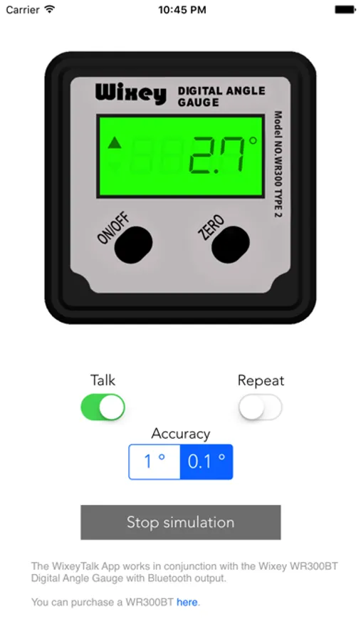The WixeyTalk App works in conjunction with the Wixey WR300BT Digital Angle Gauge with Bluetooth output. It turns your iPhone or iPad into a remote visual display and provides a talking output designed specifically for visually impaired individuals. When the App is launched it automatically connects with your WR300BT. If you do not have a WR300BT Digital Angle Gauge you can use WixeyTalk in simulation mode. It turns your iPhone or iPad into a fully functioning standalone digital angle gauge.
