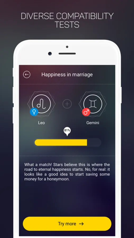 Along with astrologic forecasts, the app provides you with various proven compatibility tests. From now on, all you need is to take an appropriate test in just a few steps and get a detailed and measured answer.