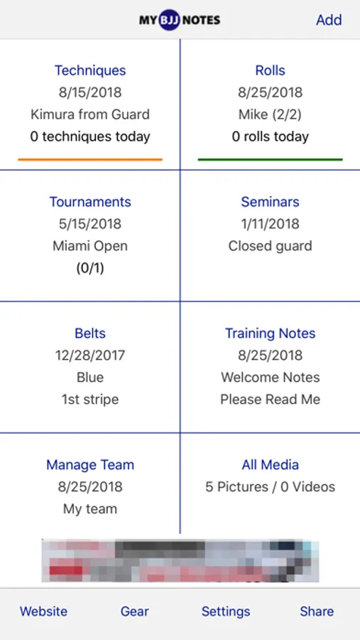 My Bjj Notes is broken down into 8 functions that include Training Notes, Techniques, Rolls, Belt Promotions, Seminars, Tournaments, View Media, and Manage team.