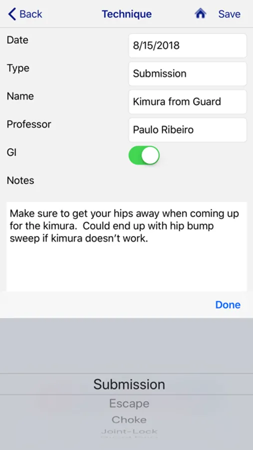 My Bjj Notes is an app designed to help you document your jiu jitsu journey. It is said that writing something down greatly enhances your ability to retain that information. My Bjj Notes allows you to write down everything about your jiu jitsu training and keep that information organized and readily available to review or add more information. With the ability to edit entries, you can make some quick notes right after class and then improve the notes as you have time or discover something to add through practicing. You can also add pictures and video to help document your journey and training.