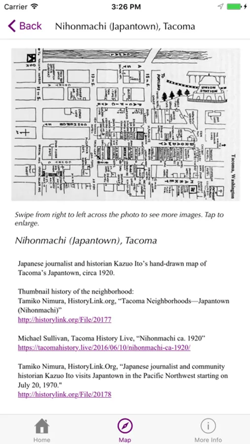 Take a walking tour of the historic Nihonmachi (Japantown) of Tacoma, WA. Included in the application is a map showing points of interest, historic and modern photos of each location, as well as links to essays and notes about this historic area that have been compiled by historian Michael Sullivan and writer Tamiko Nimura. Join a walking tour for this year's 2017 Day of Remembrance on May 18th, as the day local Japanese-Americans left Tacoma during WW II is remembered.