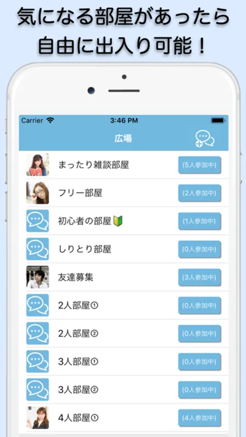 広場では複数の部屋が用意されていて、それぞれの部屋でグルチャを利用できます。