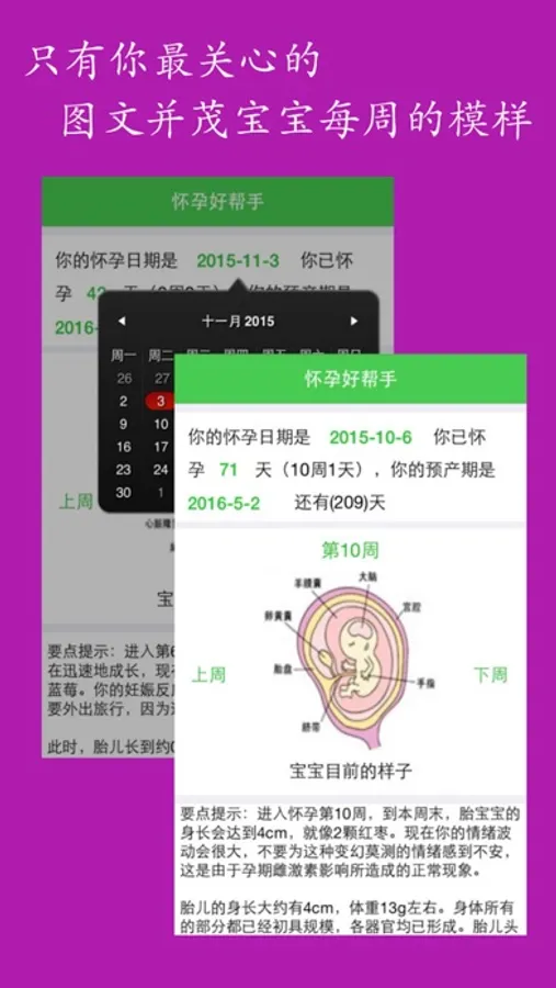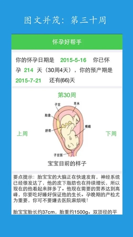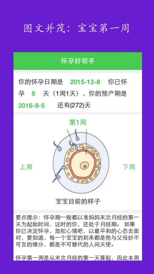 每天图文并茂的宝宝变化和妈妈变化提示,让怀孕妈妈更了解宝宝和自己。