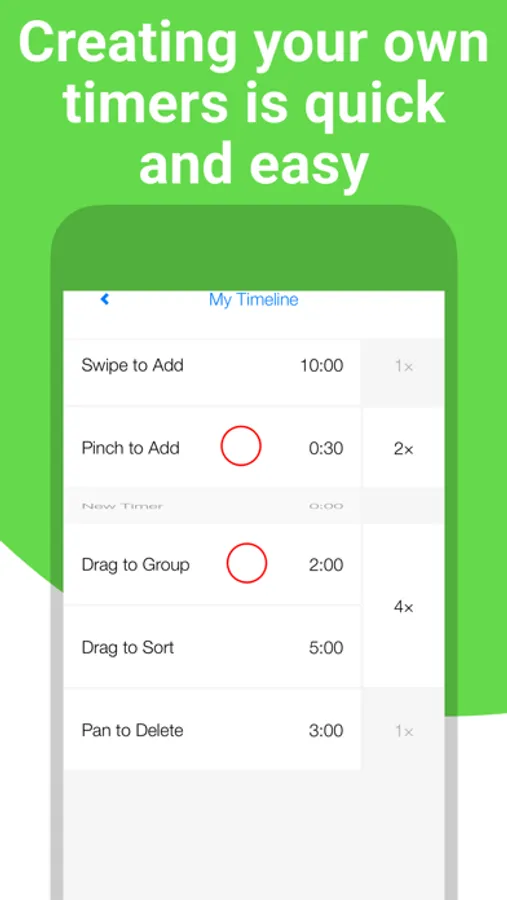 You can create your own sequences of timers quickly using intuitive gestures. There are no difficult menus and options to go through. Just swipe, pinch, pan, tap and group to build any sequence you can imagine. What you see is what you get. You can always edit your timers, even after you have started playing them.