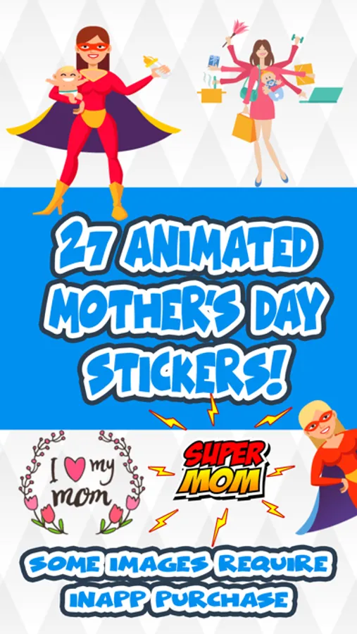 Time to shower your mother with lots of love this Mother's Day. This cute and fun animated sticker pack is just the thing. With 27 fully animated images, this pack has just what you need to put a smile on mom's face on Mother's Day or any day for that matter. What are you waiting for, your only have one mom! Update often, we update our stickers all the time.