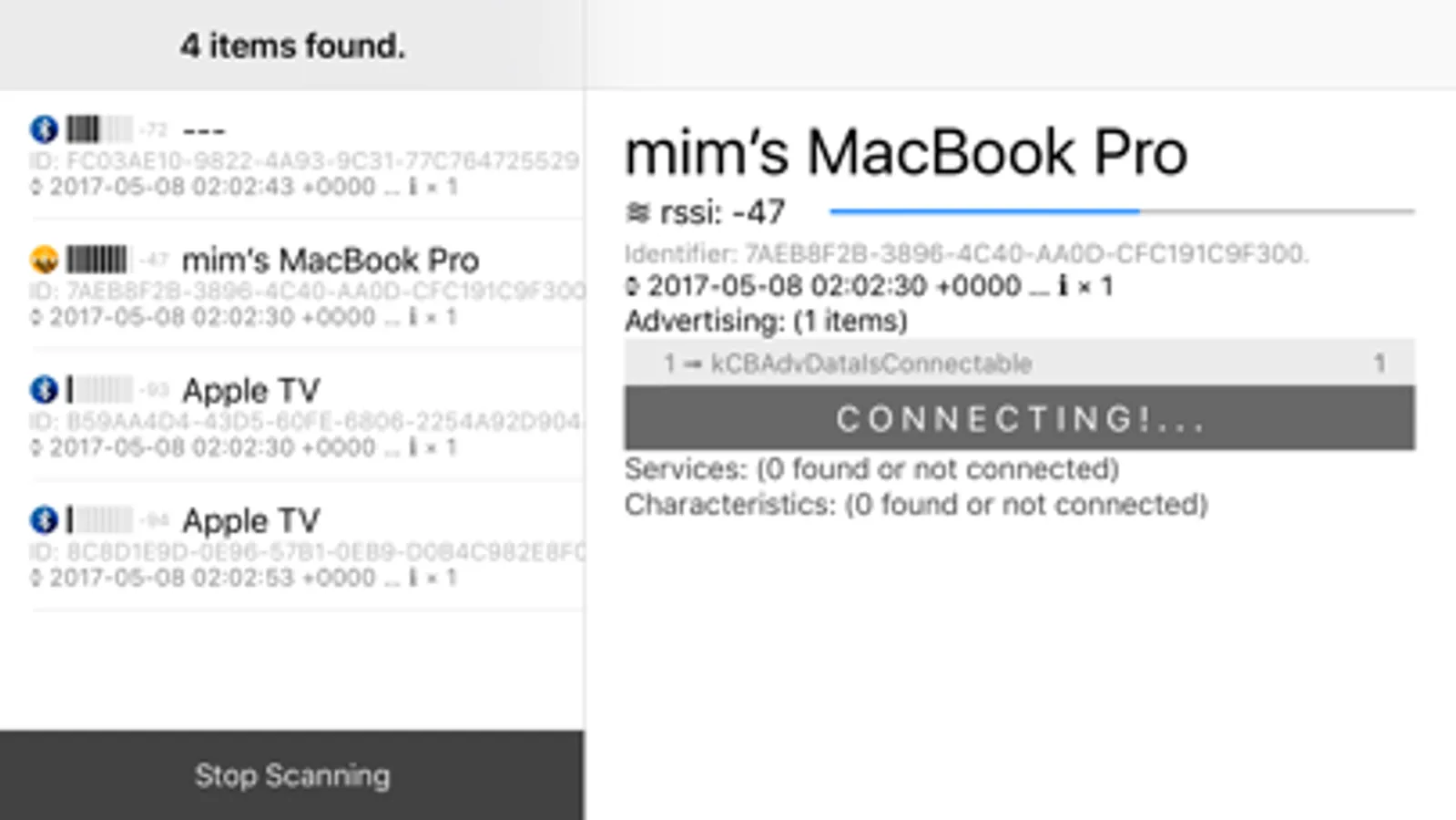 You can also connect to any of the discovered devices ( without notifying the target device ) to browse their services and characteristics. after connecting to a device you can subscribe to a service or characteristic to be notified / updated once a change was detected in the device.