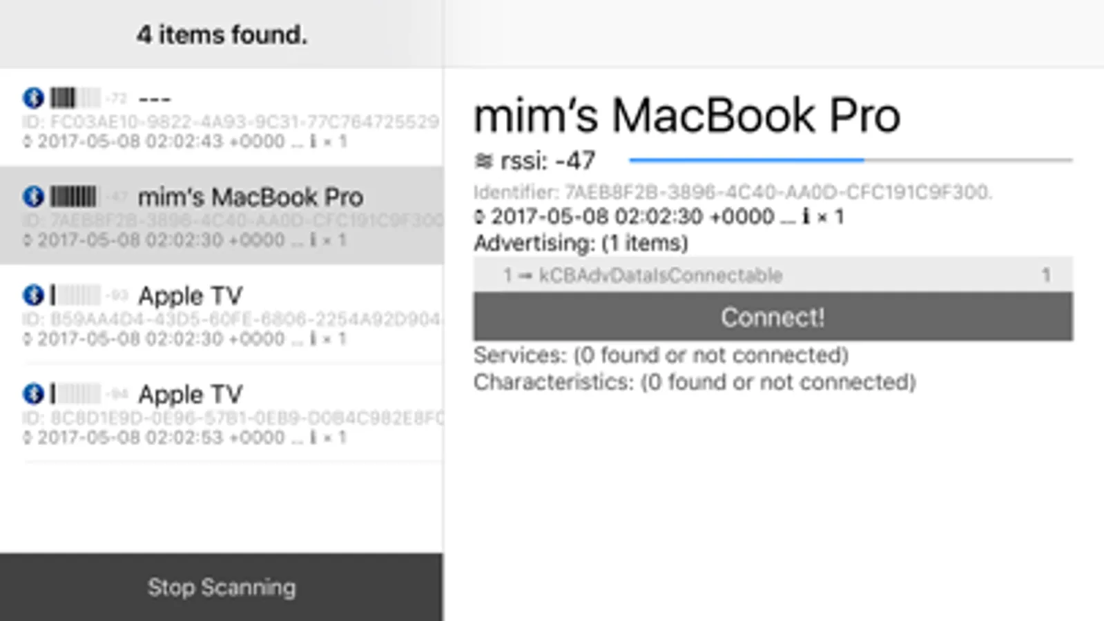 i-BLE is a free ( as of freedom! ) BLE ( Bluetooth Low Energy or Bluetooth Smart ) utility tool that helps you discover all the discoverable BLE devices around you with all the feature and information related to them.