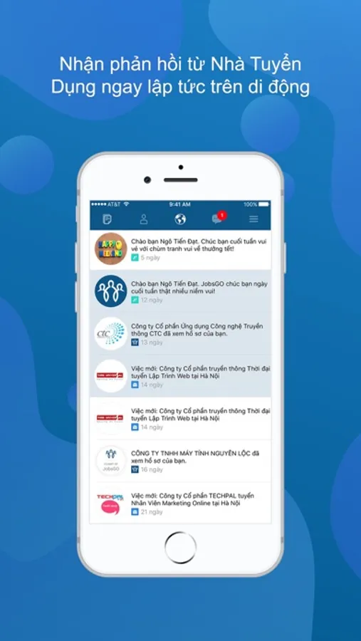 • Mỗi khi nhà tuyển dụng có việc làm mới phù hợp, bạn sẽ nhận được thông báo ngay lập tức.