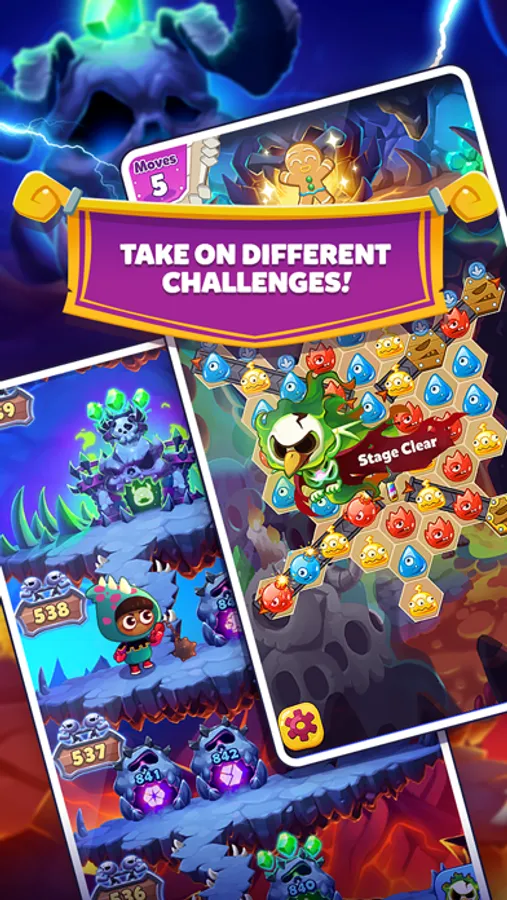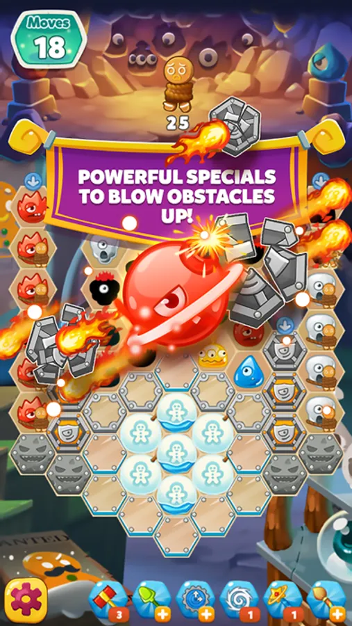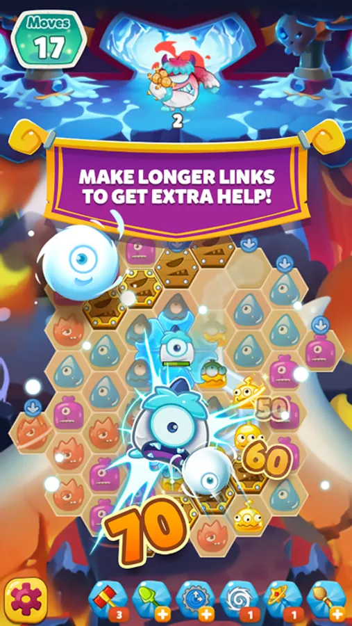 Make a match by linking 3 or more monsters of the same color to each other in 6 directions on the boards composed of hexagons. You can even make cross-connections linking already connected monsters to get Super Bombs at the intersections!