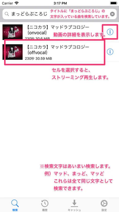 ・ニコニコ動画内にあるカラオケ映像のみを検索して表示します。