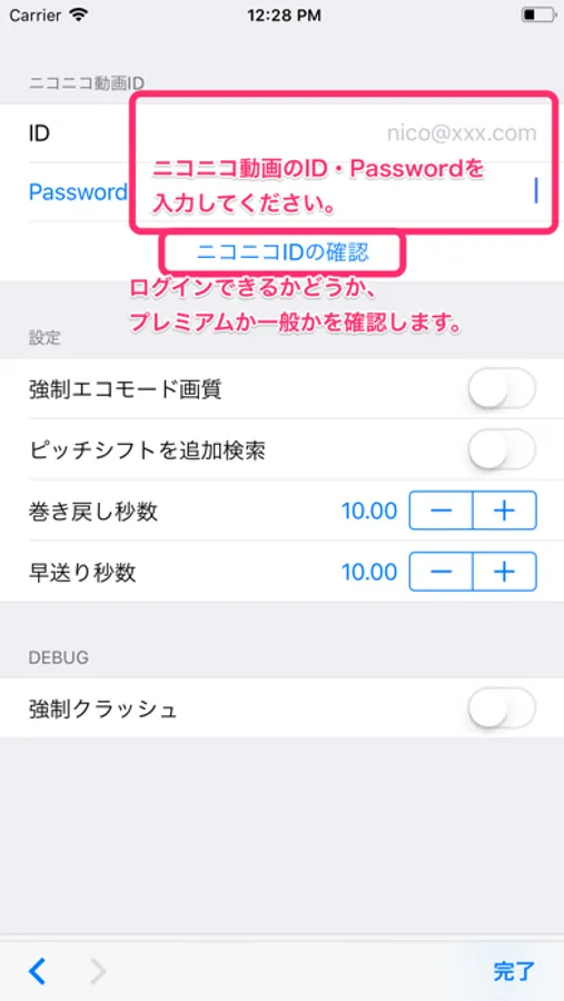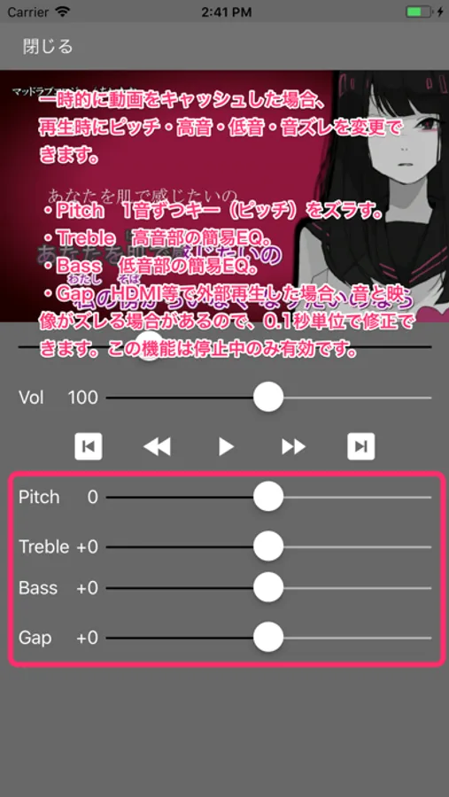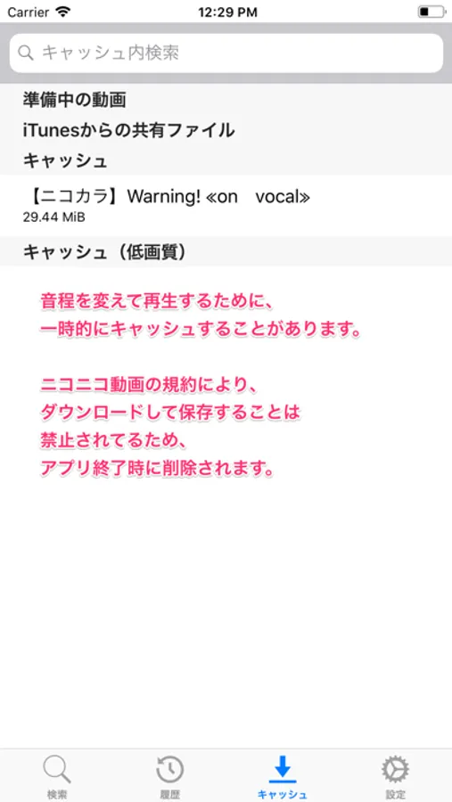 ・ピッチシフト(キー変更)するために、一時的なキャッシュ機能がありますが、ニコニコ動画の利用規約の制限のためアプリ終了時にキャッシュは削除されます。