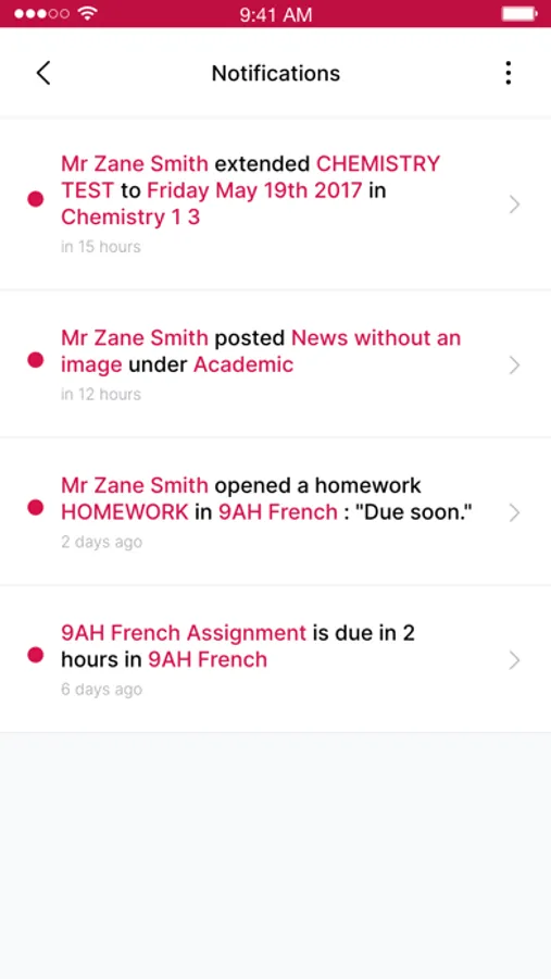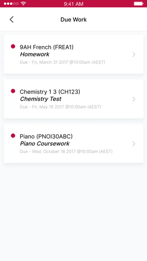 Calendar: the Calendar provides parents, teachers and students a personalised view of what's coming up for the day or in the future. Students can also receive reminders when the due date for their work is approaching
