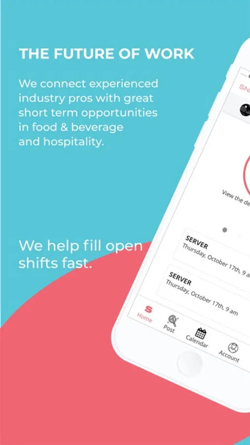 The simple way to work— Get shift alerts for on-demand opportunities, or view the calendar for shifts further out to earn income at new and exciting venues. Using the app is simple: claim a shift you qualify for, arrive at the indicated time ready to contribute, get paid (rinse & repeat). All approved workers are 1099 contractors of SNAPSHYFT.