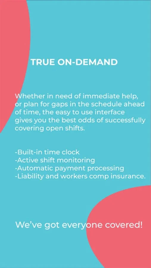 Whether in need of immediate help, or plan for gaps in the schedule ahead of time, the easy to use interface gives you the best odds of successfully covering your open shifts with vetted high-caliber professionals. With built-in time clock, active shift monitoring, automatic payment processing, liability and workers’ comp insurance, we’ve got you covered with the industry's most reliable staffing solution.