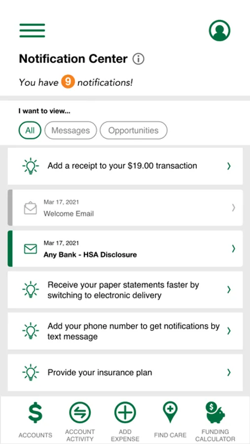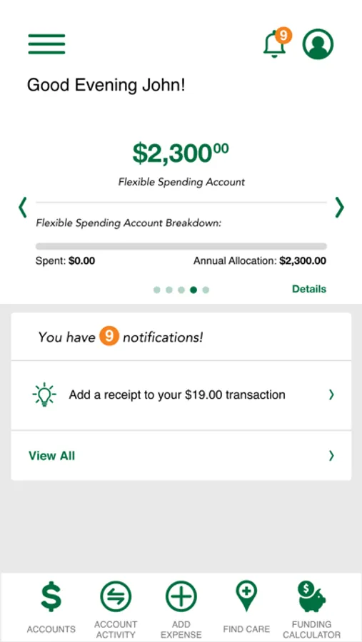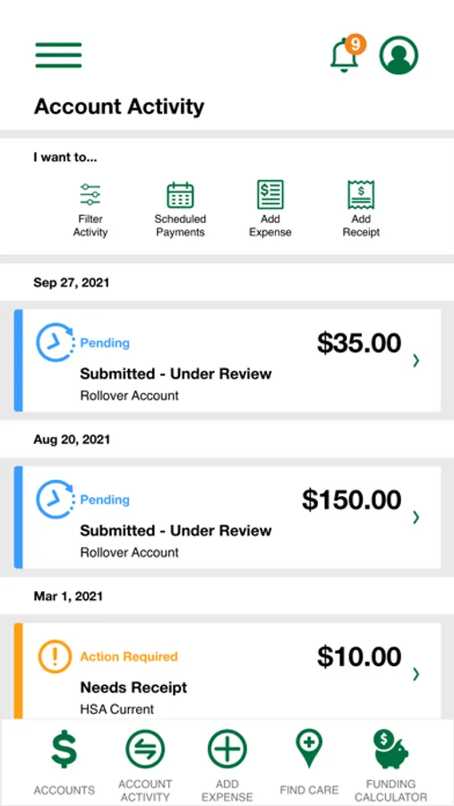 • Claims: Submit a claim, add receipt images, and view pending claims