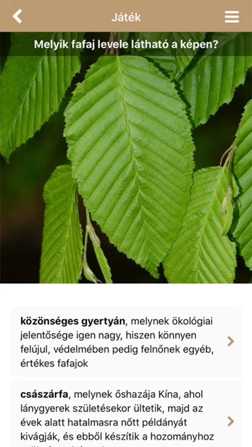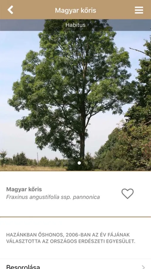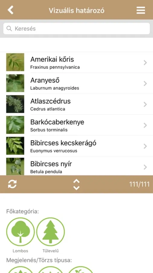 - Választhatod a vizuális meghatározás funkcióját, hogy levele, törzse, termése, lombkoronája stb. alapján pontosan beazonosíthasd az előtted tornyosuló fát.